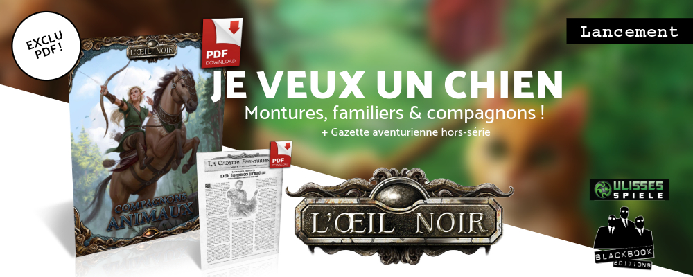 Alors que se poursuivent les précos bundle pour Les Royaumes ennemis, nous vous proposons une double dose d'Oeil Noir en partenariat avec les Ateliers d'Alrik, avec, histoire de fêter l'impression des Royaumes ennemis, la Gazette hors-série numéro 1 (pur-PDF) ainsi qu'un nouveau supplément complet, pur-PDF pour la gamme L'Oeil Noir : les Compagnons animaux.