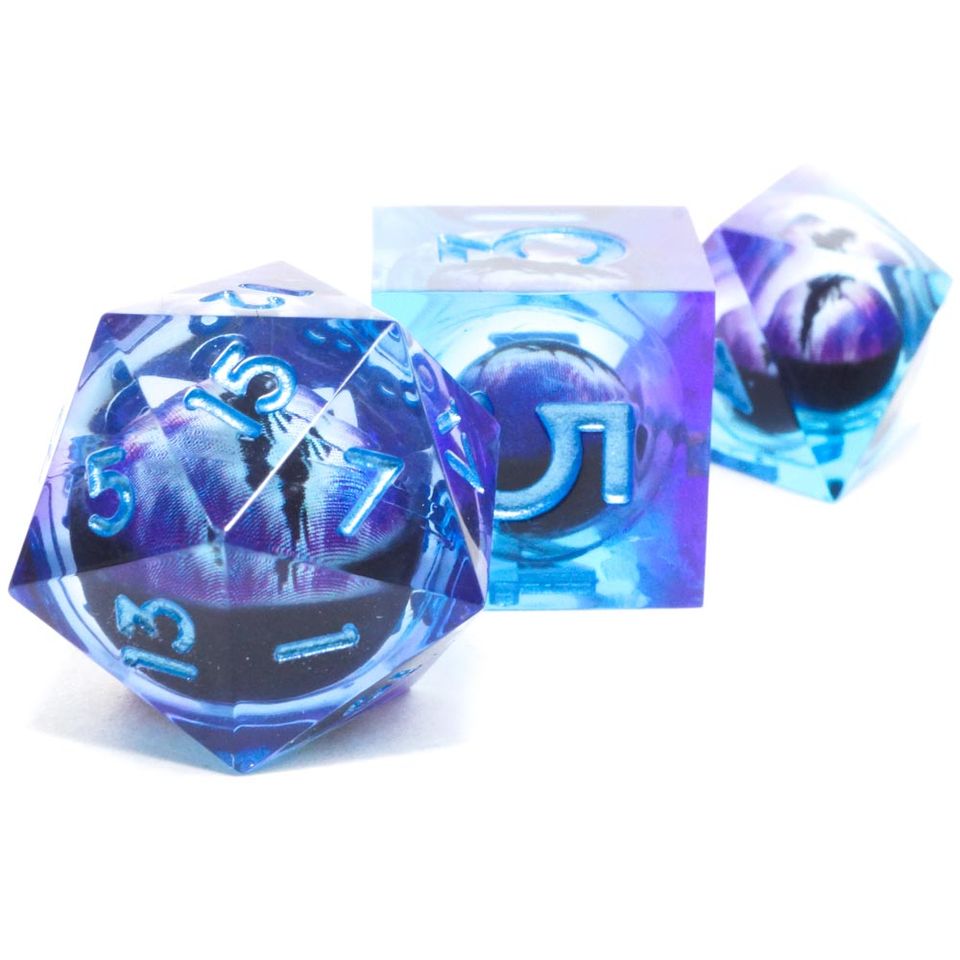 - Si vous préférez, nous pouvons aussi vous proposer .... 1 seul oeil mais dans plein de dés différents, avec ce set de dés bleus comprenant un oeil violet !