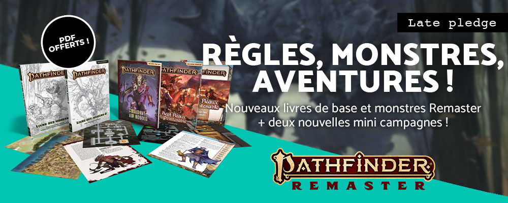 Le Late Pledge pour les prochains suppléments Pathfinder 2 et Remaster permet à celles et ceux qui ont loupé la précommande participative d'acquérir les ouvrages de cet ensemble de suppléments, toujours avec les PDF offerts (dès qu'ils seront prêts) !