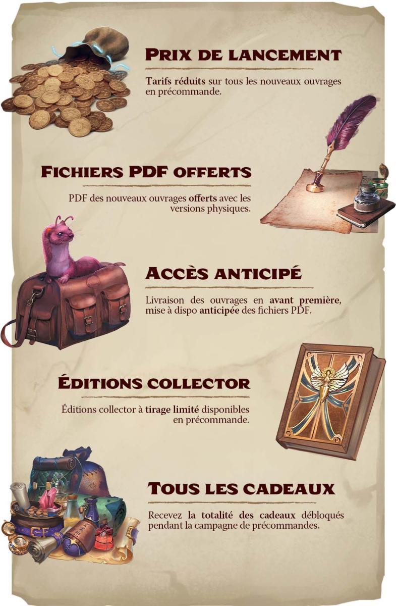 Foncez précommander les suppléments Pathfinder et faites monter la cagnotte pour débloquer les prochains cadeaux ! En participant à la précommande, vous bénéficiez évidemment des PDF des ouvrages offerts et de tarifs réduits sur certains ouvrages, plus tous ces avantages :