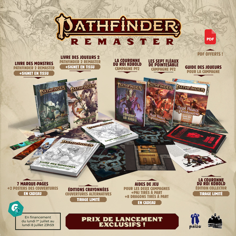 Précommandez avant ce soir 23h59 pour recevoir le Livre des Joueurs 2, le troisième livre de base de l'édition Remaster de Pathfinder, le Livre des Monstres, le nouveau bestiaire de l'édition Remaster contenant plus de 400 monstres, la Couronne du Roi Kobold, une campagne mythique repensée et augmentée pour Pathfinder 2 et les Sept Fléaux de Pointesable, une campagne pour Pathfinder 2 !
