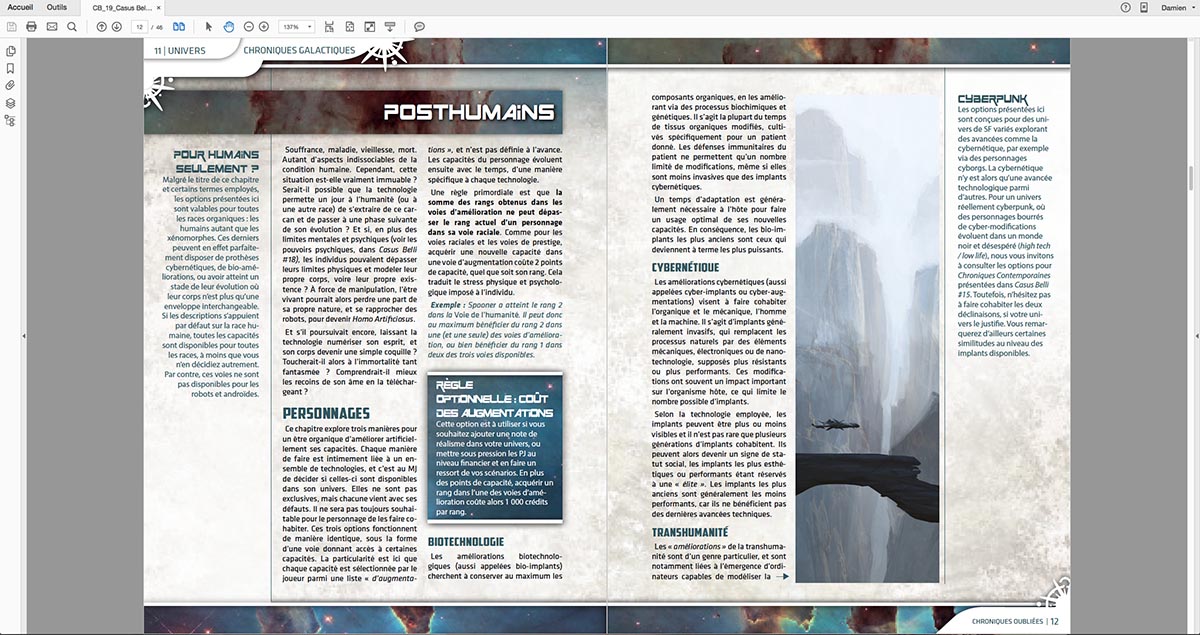 Thomas Robert, l'auteur, nous a d'ailleurs concocté trois nouvelles voies "raciales", accessibles aux PJ, sous réserve d'acceptation du MJ bien-entendu, celles du robot, de l'androïde et de l'IA. Évidemment ce thème nécessite de proposer des nouveautés du côté de l'équipement, avec toute la gamme des robots et des drones. Niveau règles, le jeu s'étoffe également de trois nouvelles voies et leurs capacités : le Bioorg (greffes), le Cyborg (implants) et le Posthumain.