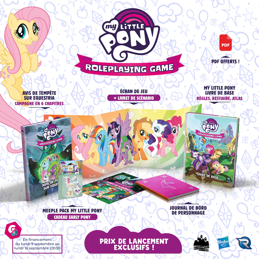 Rassemblez tous vos amis et partez à l’aventure avec la version française de My Little Pony Roleplaying Game ! Précommandez les nouveaux ouvrages, faites monter la cagnotte et profitez de tous les avantages d’une précommande participative Black Book Éditions !
