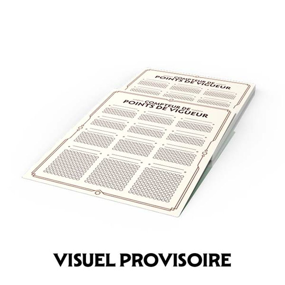 Quant aux compteurs de points de vigueur, cest un petit outil pratique pour pouvoir gérer la santé de vos personnages joueurs et de vos créatures au fil de vos combats. Le bloc contient 50 feuilles. Sur chacune, vous pourrez gérer jusqu'à 4 PJ ou créatures ayant jusqu'à 50 PV chacun, soit 200 PV par feuille .