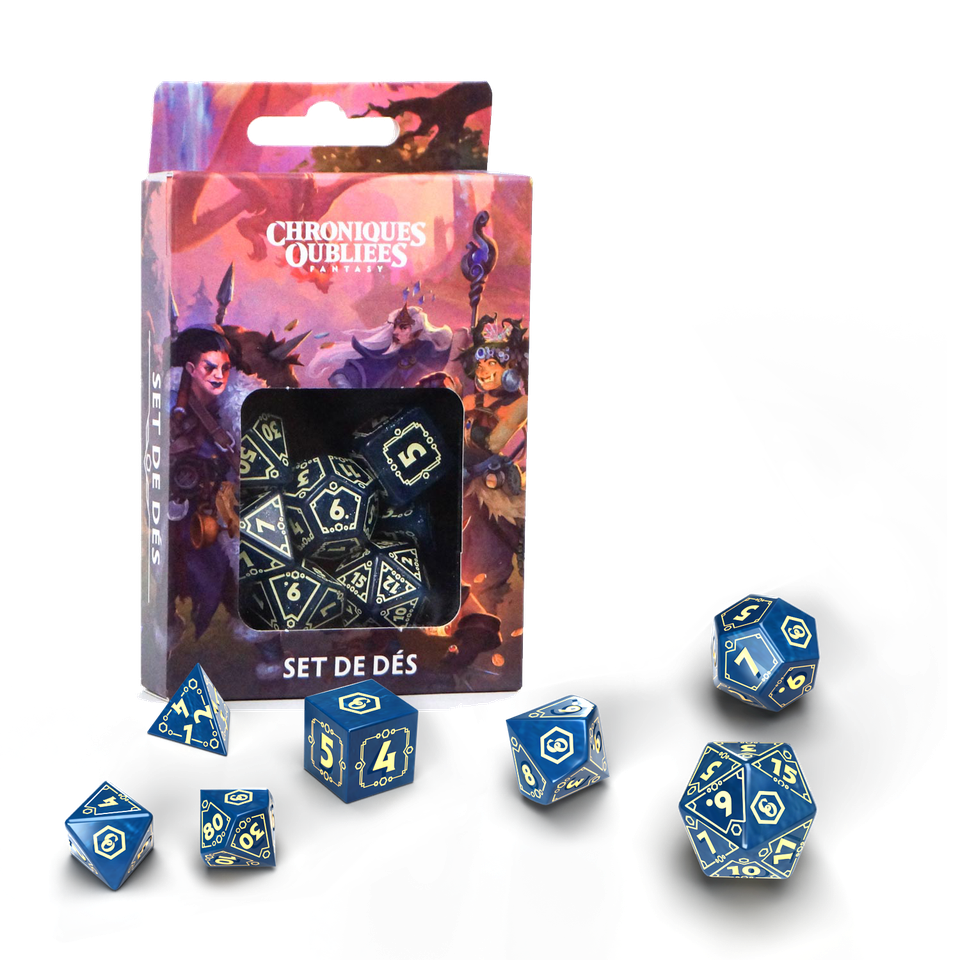 Le splendide set de dés officiel Chroniques Oubliées Fantasy qui rassemble les 7 dés classiques du jeu de rôle (d4, d6, d8, 2d10 dont 1 de dizaines, d12, d20) est fabriqué par Q Workshop.