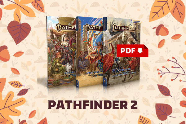 L'offre concerne tout particulièrement les nouveaux ouvrages pour Pathfinder, Seconde édition arrivés en tout début d'été : le Livre des joueurs (Remaster), le Livre du MJ (Remaster), mais également les superbes suppléments Absalom - cité des Prédictions perdues et son complément Grand bazar dédié au quartier marchand de la ville, mais également L'Etendue de Mwangi.