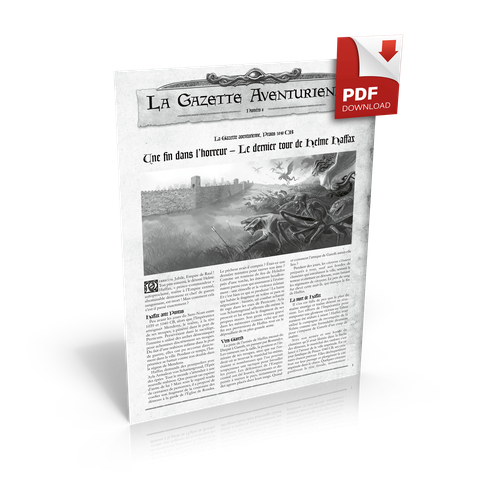 La Gazette aventurienne est publiée à la fois en Aventurie et sur notre bonne vieille Terre. Elle vous permet de suivre les événements qui se déroulent dans l'univers du jeu, ce qu'on appelle l'histoire vivante, au travers d'articles rédigés par des journalistes aventuriens. Certains ont des liens avec des scénarios et permettent de les enrichir, d'autres pourront vous servir d'inspiration.