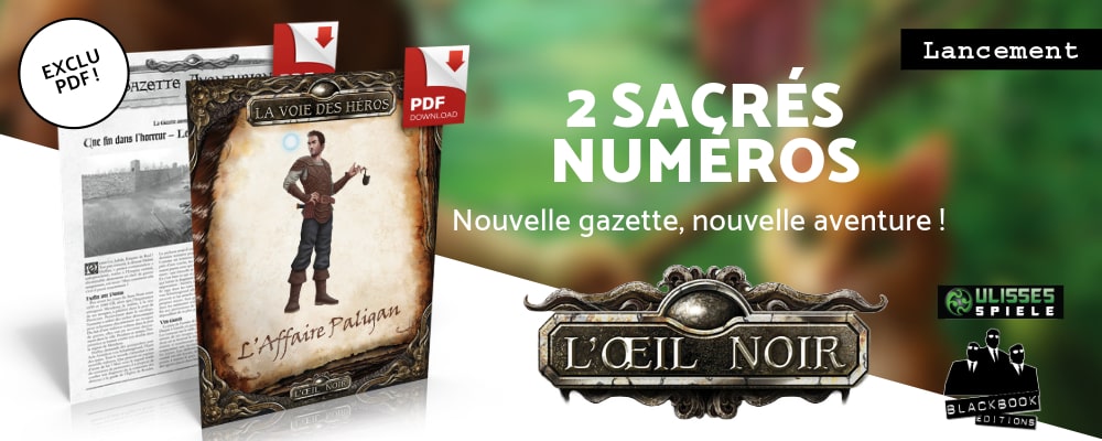 Nous vous proposons une double dose d'Oeil Noir en partenariat avec les Ateliers d'Alrik, avec la Gazette aventurienne numéro 8 (pur-PDF) ainsi qu'une nouvelle aventure pur-PDF pour la gamme L'Oeil Noir : les L'Affaire Paligan.