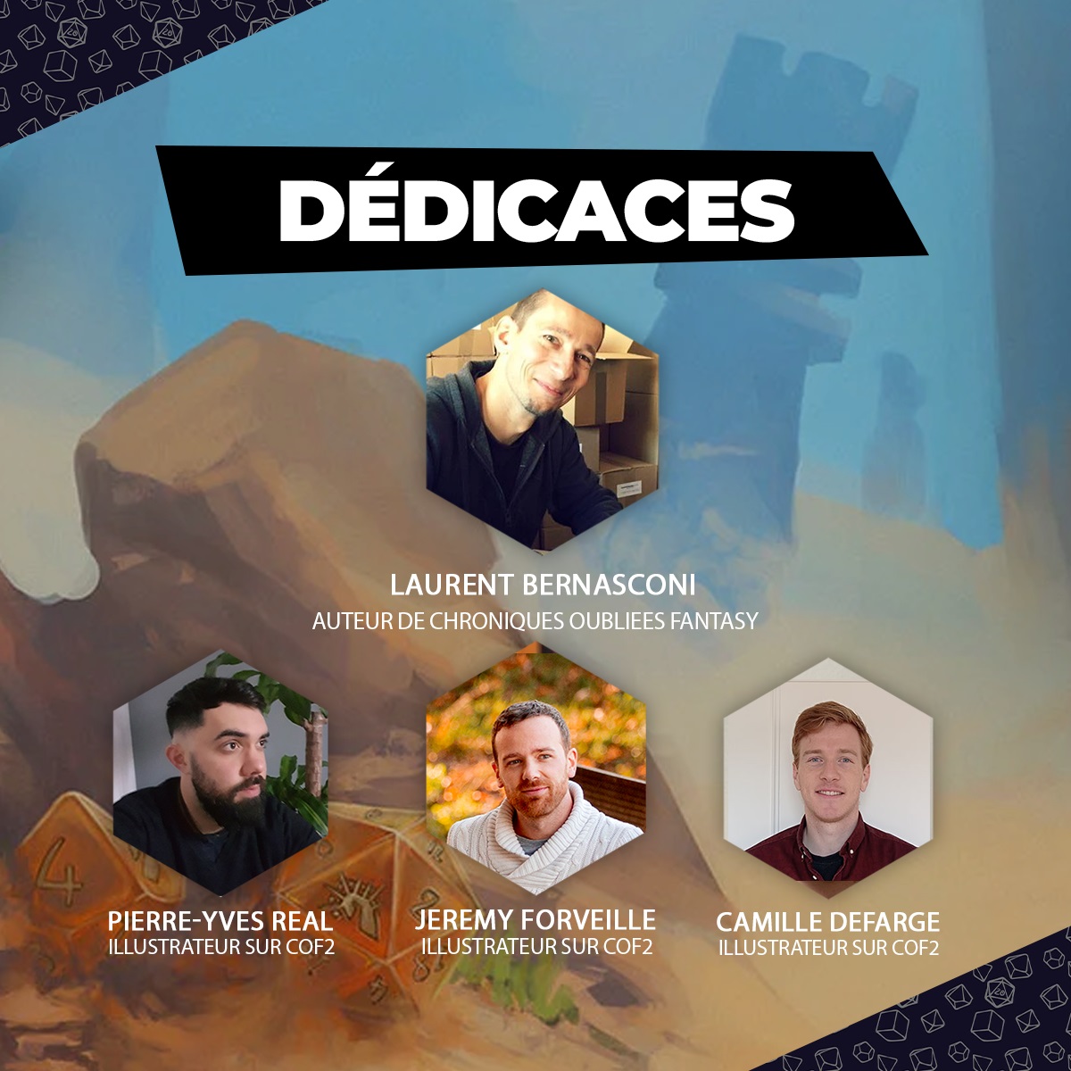 - 17h00 : Laurent Bernasconi (auteur du jeu), Jérémy Forveille et Camille Défarge (illustrateurs) pour la gamme Chroniques Oubliées Fantasy 2e édition