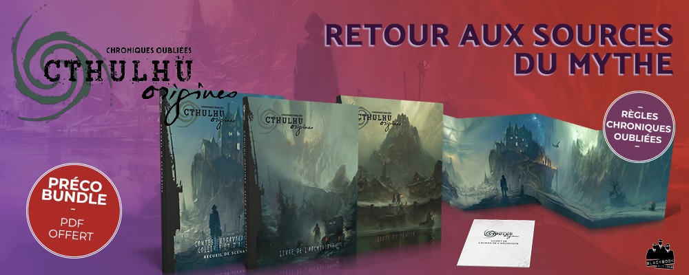 La gamme motorisée par Chroniques Oubliées qui revient aux sources de l'oeuvre de Lovecraft, c'est Cthulhu Origines dont la lente et mouvementée gestation arrive enfin à son terme : nous fignolons les derniers détails sur les aides de jeu, les fiches de prétirés et les dossiers de personnage avant de boucler le projet pour départ à l'impression. Toutes les versions PDF des ouvrages ont déjà été livrées aux backers et précommandeurs : Livre de l'Archiviste (MJ) et du Témoin (PJ), écran de jeu et recueil de scénarios auquel ont participé plusieurs auteurs réjouissants : Sylvain Forge, Nathalie Zema, Alexis Flamand, Christophe Rosati, Willy Dupont et Benjamin Ott !