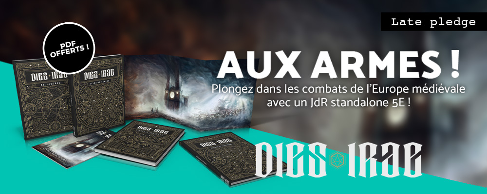 Dies Irae est la future gamme de jeu de rôle aux règles inspirées de la 5E, compatible 5E et Rôle'n Play qui se déroule dans l'univers de la Guerre de Cent Ans - un monde historique mâtiné d'un fantastique suggéré et qu'il sera possible de moduler, "médiéval-fantastique" au sens strict du terme, sans franchir pour autant le seuil de la fantasy.