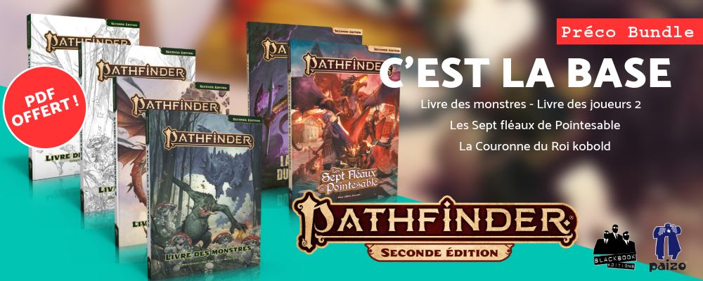 - Les premiers ouvrages de la version Remaster des règles de Pathfinder 2 (Livre des joueurs, Livre du MJ, écran) qui sont suivis par le Livre des joueurs 2 et le Livre des monstres actuellement en Préco Bundle - livraison attendue en cette fin d'année.