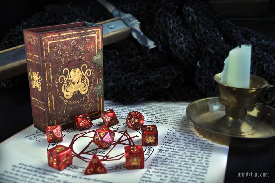 - Encore quelques dés pour la route avec les sets Elder Dice Brand of Cthulhu (Red Edition) et Yellow Sign ((Mythic Black Amber Edition).