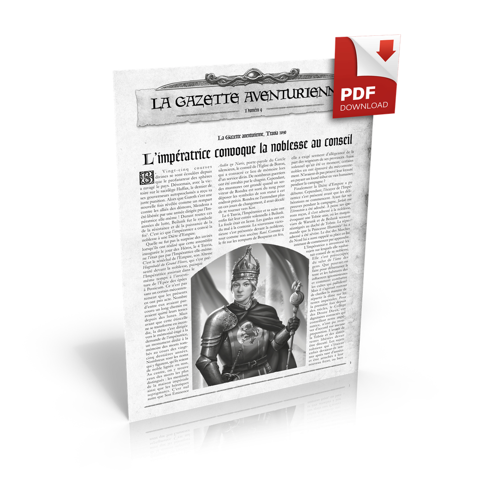 La Gazette aventurienne est publiée à la fois en Aventurie et sur notre bonne vieille Terre. Elle vous permet de suivre les événements qui se déroulent dans l'univers du jeu, ce qu'on appelle l'histoire vivante, au travers d'articles rédigés par des journalistes aventuriens. Certains ont des liens avec des scénarios et permettent de les enrichir, d'autres pourront vous servir d'inspiration.