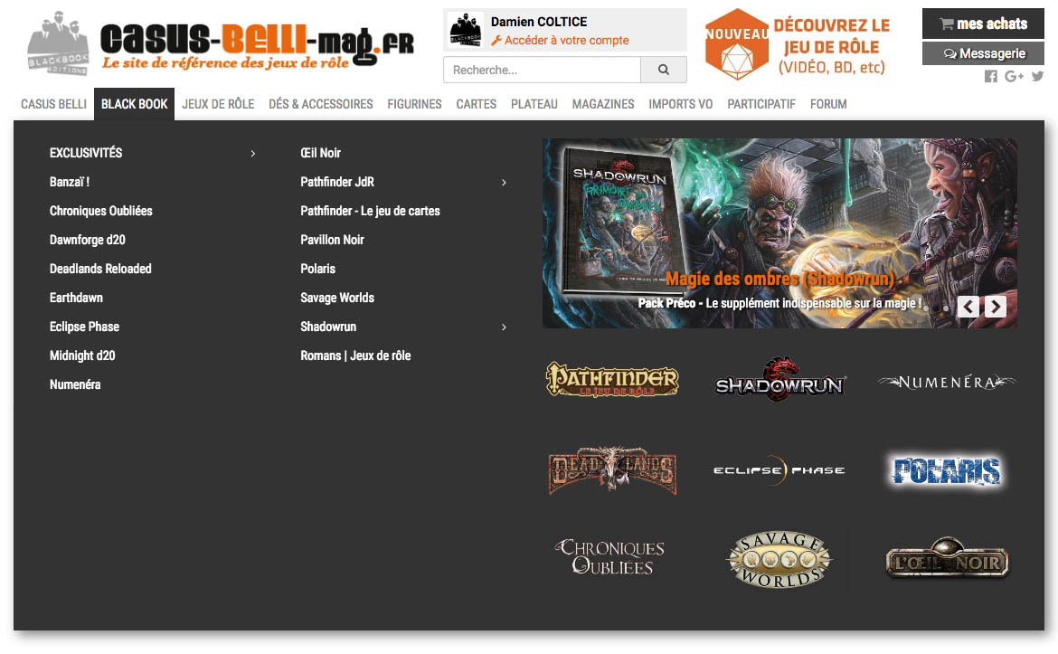 Honneur à l'éditeur responsable de ce nouveau site, Black Book Editions dispose de pages dédiées sur le site Casus. Il faut bien comprendre que le menu principal s'articule autour du fonctionnement de la boutique et de la classification des jeux. Il a donc fallu proposer un menu "Black Book Editions" à part, fonctionnant de la même manière qu'ailleurs, mais proposant du contenu supplémentaire lié à ce que se doit de proposer tout site d'éditeur.