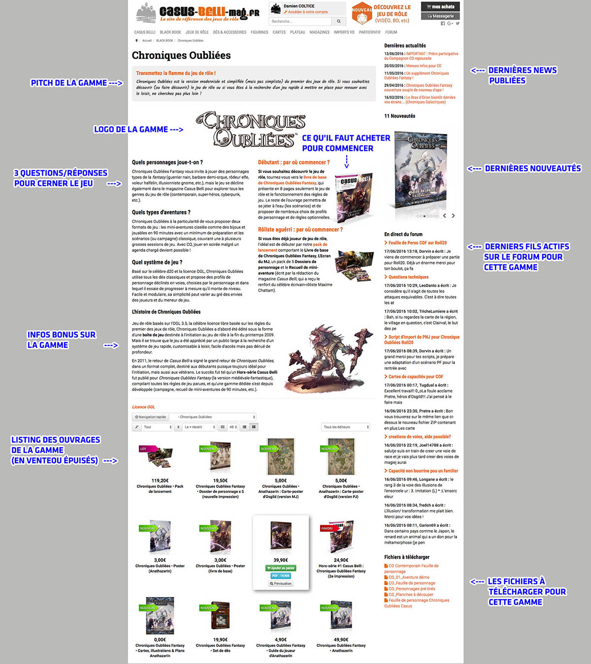 La colonne de droite des pages de descriptif des gammes vous permettent également de suivre les dernières actualités publiées pour chaque gamme spécifiquement, de voir les dernières nouveautés, les derniers fils actifs du forum dédié à chaque gamme et l'intégralité des fichiers téléchargeables gratuitement (comme les feuilles de personnage par exemple).