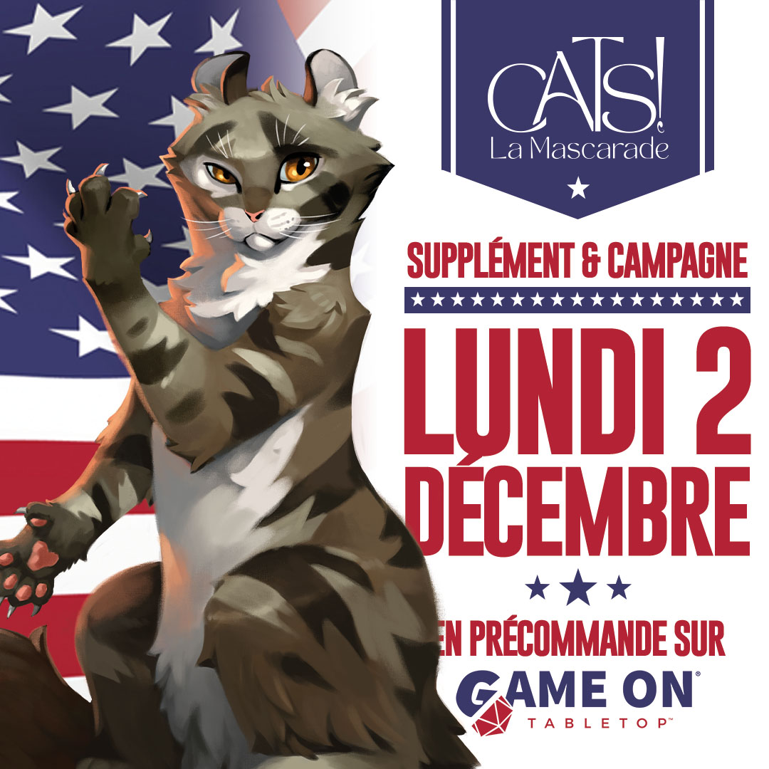 Aidez-nous à transformer ce projet en vraie chat-venture fabuleuse : rendez-vous le lundi 2 décembre sur Game On Tabletop pour précommande les prochains suppléments Cats! en échange d'un peu de vos croquettes, recevez la nouvelle campagne pour Cats! se déroulant aux USA mais aussi des cadeaux, des avantages exclusifs... Et bien d'autres surprises !