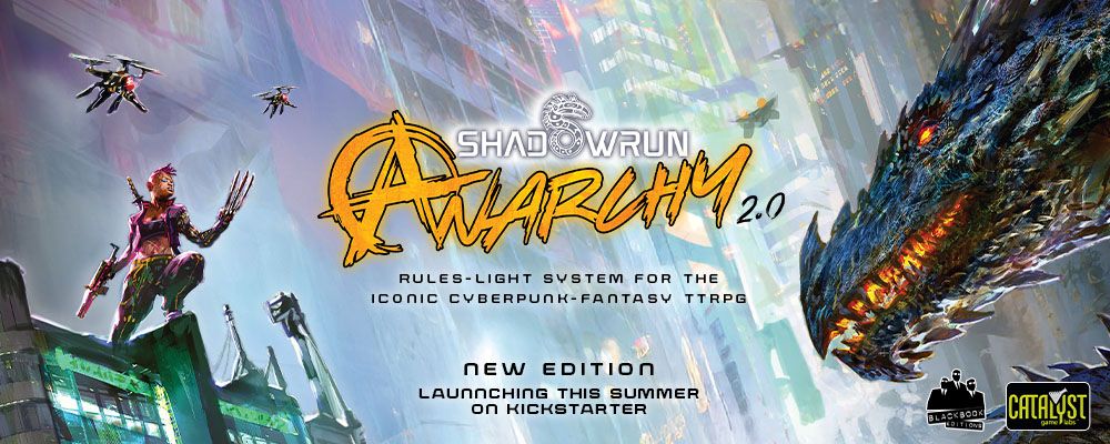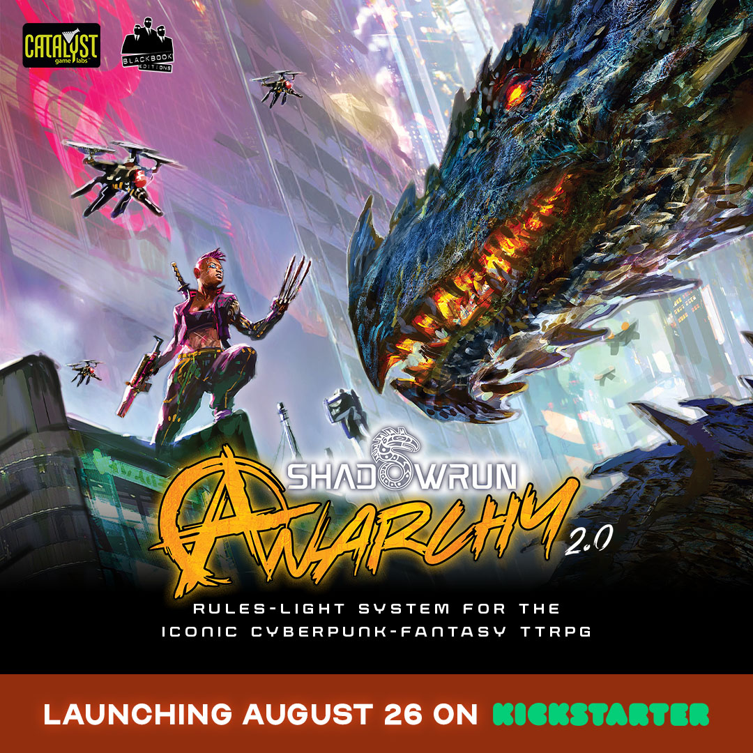 June, 27th 2025 — Catalyst Game Labs (CGL) and Black Book Editions (BBE) are thrilled to announce the upcoming launch of Shadowrun: Anarchy 2.0, the rules-light alternative core book for the legendary Shadowrun roleplaying game. Set to debut on Kickstarter this summer (Tuesday, August 26th), this new edition builds on a rich legacy of cyberpunk-fantasy storytelling, while making the game more accessible than ever.