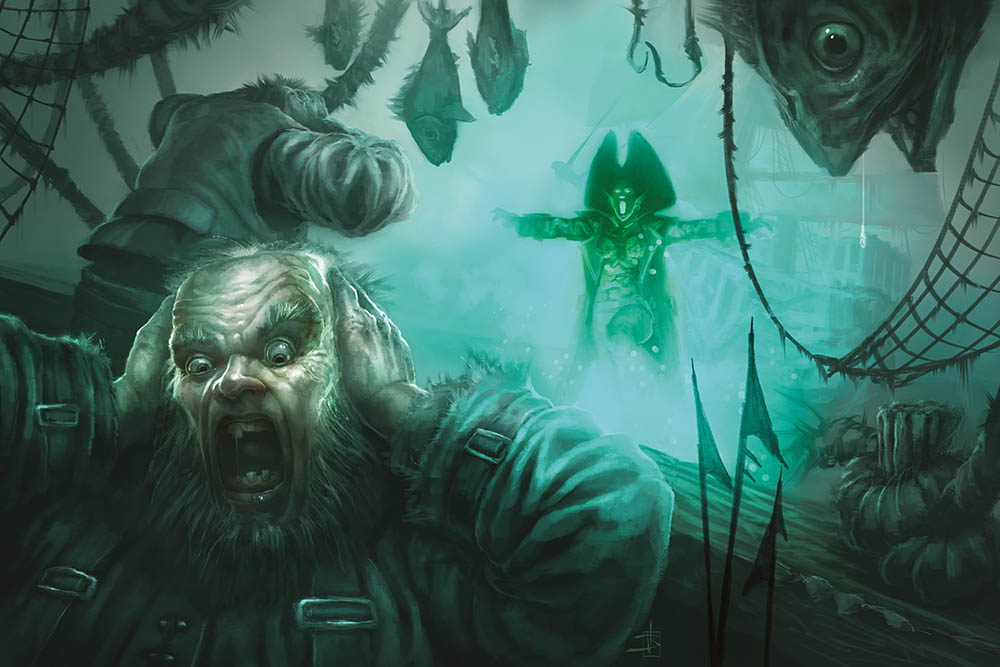 C’est quand il se rapproche que sa nature devient évidente. La coque est noircie et abîmée, les mâts éclatés tels des arbres frappés par la foudre et les voiles en lambeaux qui claquent comme de la peau lacérée. Mais c’est l’équipage la véritable menace : des elfes draugrs, des archers cadavériques et la plus acerbe des banshies que vous puissiez imaginer. Ils disent que chacun de ses hurlements exprime l’angoisse accumulée lors de plusieurs vies. D’après eux, même l’infime écho de ses cris peut faire bouillir le sang d’un marin et, si ce navire approche du vôtre, c’est certainement la dernière chose que vous entendrez.