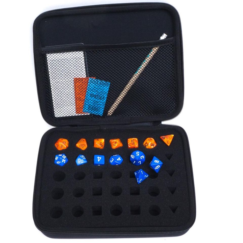 Cette collection se présente dans un écrin noir orné d'un dé 20 stylisé doré, à l'intérieur, une mousse en velours à encoches maintient les dés en place.