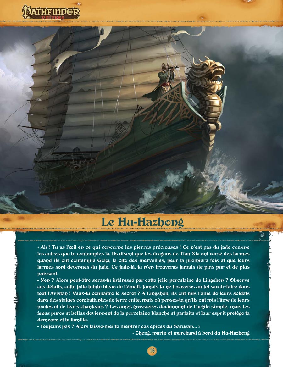 Pour cette nouvelle preview, nous vous proposons une page tirée de l'ouvrage, l'entrée du chapitre dédiée au bâtiment appelé le Hu-Hazhong, un vaisseau de marchandises exotiques transportant des personnages fascinants venus des Empires du dragon.