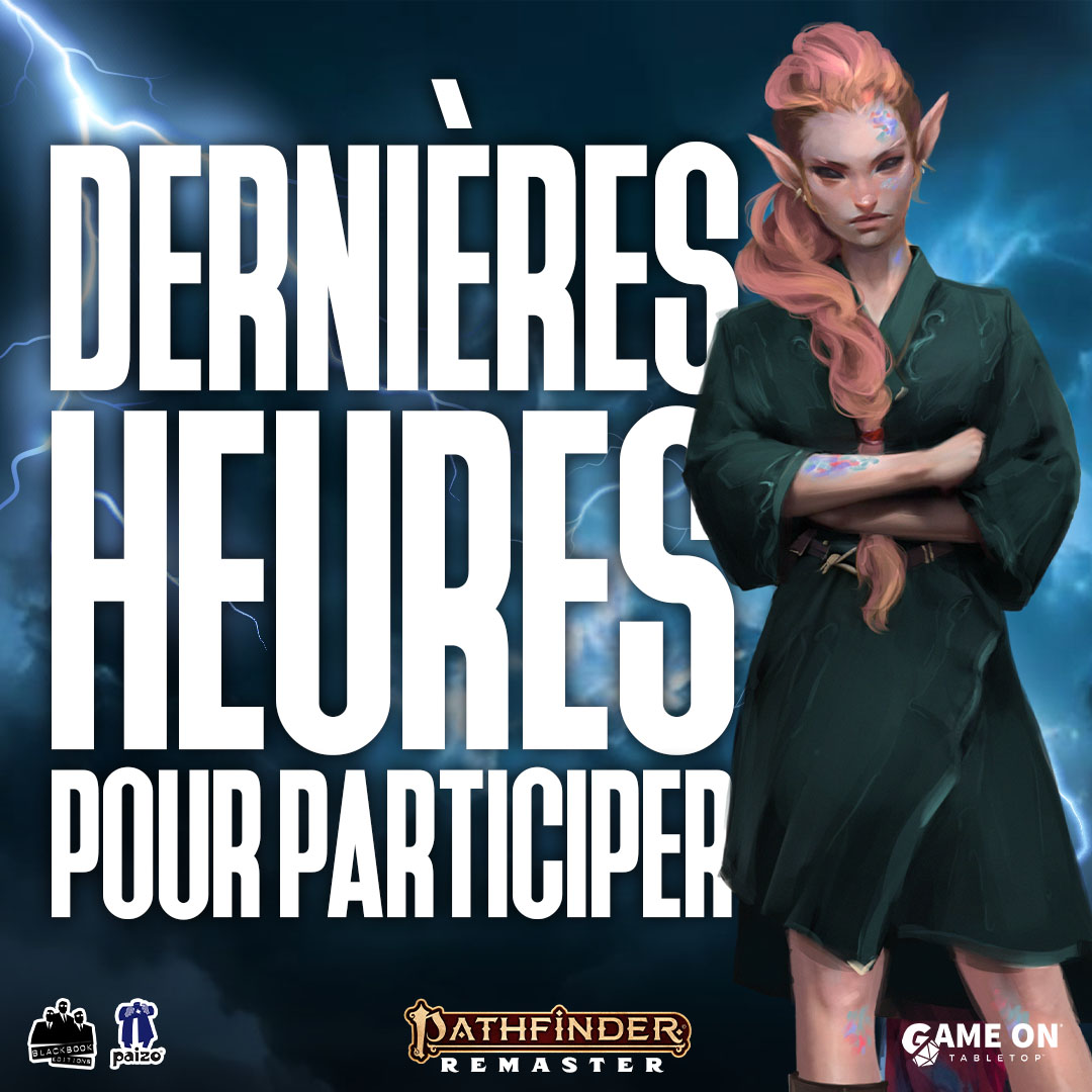 La précommande pour le supplément de règles La Guerre des Immortels, les campagnes Rideau! et Quand les Dieux Mentent et l'ouvrage d'univers Mystères Divins des Prédictions Perdues pour Pathfider Remaster se termine ce soir à 00h sur Game On Tabletop !