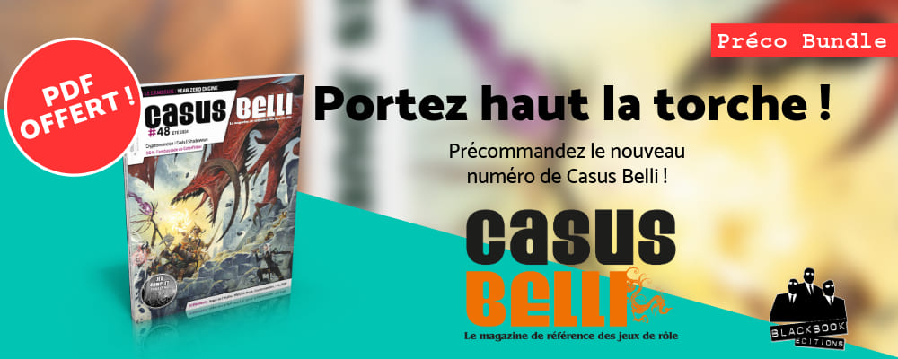 Désormais, pour des raisons pratiques, nous alignons Casus Belli sur les modalités habituelles de lancement de nos autres ouvrages de jeu de rôle : le Préco Bundle. Dès que la version numérique d'un ouvrage est prête, nous en lançons la précommande, ce qui vous permet de bénéficier du PDF offert, mis à disposition immédiatement pour toute préco (quelques minutes / heures de patience sont parfois nécessaires en fonction du trafic), ainsi que d'une livraison anticipée. Spécifiquement pour les précos Casus Belli, les frais de port restent limités à 1 centime vers la France métropolitaine, comme l'abonnement précédemment.