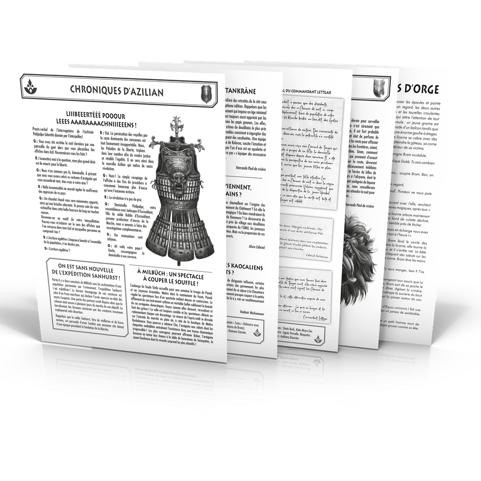 Laelith - Chroniques des Provinces du Haut Lac : un ensemble de livrets courts regorgeant de textes et de détails sur les provinces visités dans la campagne La Dernière Frontière. Les joueurs et les MJ pourront plonger dans ces petits récits pour découvrir des petits éléments de lore et de background qui viendront enrichir l'expérience de jeu.