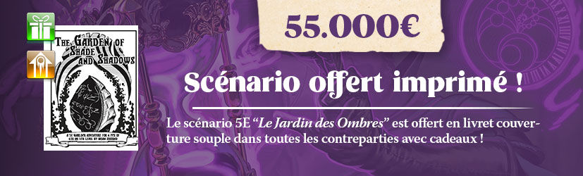 À l'heure où nous écrivons ces lignes, il manque moins de 3500€ pour que la cagnotte dépasse les 55k : cela représente seulement une poignée de backers ! L'objectif est à portée de main et il permettra de débloquer un nouveau cadeau ; le scénario 5E Le Jardin des Ombres, compatible Rôle'n Play, imprimé en livret couverture souple et offert aux backers !