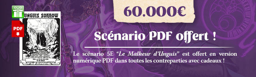 Faites encore monter la cagnotte pour débloquer un nouveau scénario en cadeau ! Le PDF de l'aventure 5E Le Malheur d'Unguis sera ajouté aux contreparties avec cadeaux !