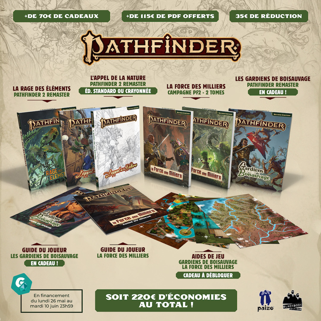 La précommande Pathfinder : Nature Mystique, c'est plus de 70€ de cadeaux, près de 115€ de PDF offerts, 35€ de réduction avec les tarifs de lancement, pour un total de 220€ d'économies !