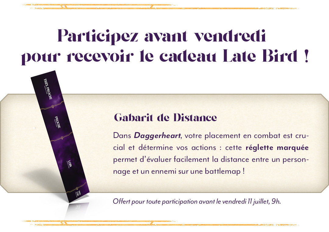 Pour toute précommande avant le vendredi 11 juillet 9h, recevez le cadeau Late Bird : le Gabarit de distance compatible Daggerheart ! Et oui, ce cadeau est également disponible pour celles et ceux qui ont participé jusqu'à maintenant !