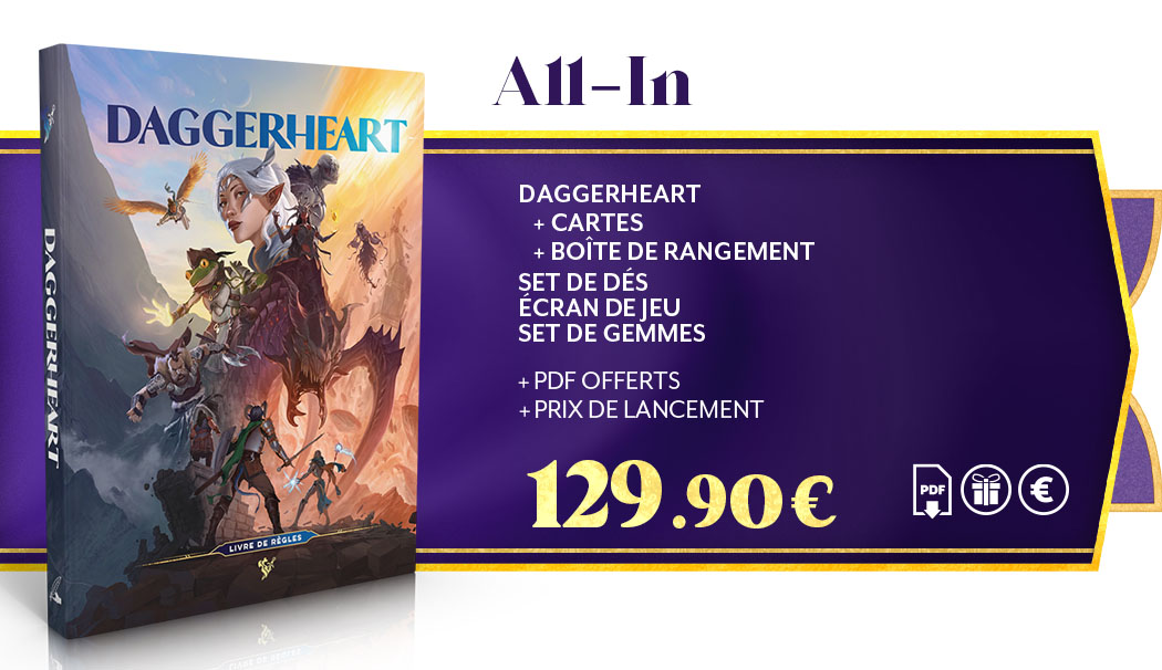 La précommande pour Daggerheart se clôture ce soir à 23h59 ! Si vous n'avez pas encore participé, il n'est pas trop tard pour sélectionner une contrepartie et profiter de tous les avantages !