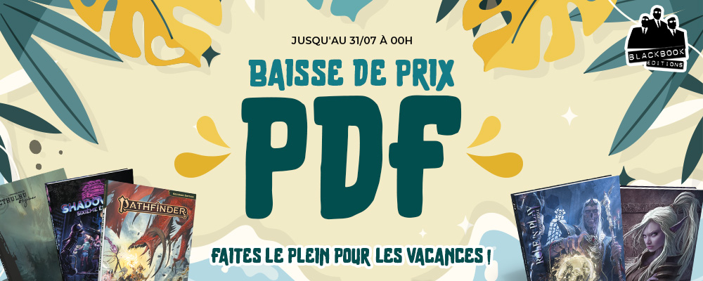 L'offre concerne tout particulièrement les nouveaux ouvrages pour Pathfinder, Seconde édition comme le Livre des joueurs (Remaster) ou le Livre du MJ (Remaster), les ouvrages Ptolus mais également les PDF pour Chroniques Oubliées 2e édition comme le Tome 1 de la campagne Calice et le Tome 2 ou des campagnes 5E / Rôle'n Play comme L'Enfant-nuit ou les 3 tomes des Plaies ouvertes !