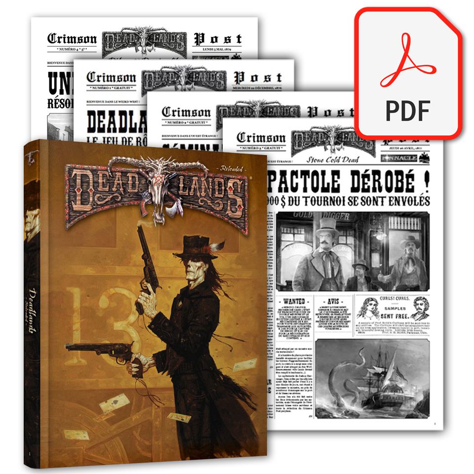 - Deadlands Reloaded - Livre de Base (PDF) : un jeu mêlant Western et magie, inventions improbables et créatures indicibles, dés, jetons et cartes de poker. Plus sombre, plus rapide, plus fluide, il est désormais propulsé par Savage Worlds, un nouveau système plus efficace qui garde néanmoins toute la saveur de l’édition précédente.