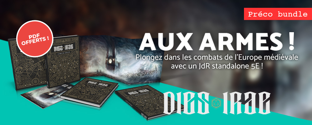 Construit à partir du DRS 5e, Dies irae offre une grande variété d’ambiances et de possibilités d’aventures : participez à des batailles rangées ou acceptez des missions discrètes, mesurez vous aux plus grands chevaliers de votre temps ou menez l’enquête face à des machinations ourdies dans l’ombre.