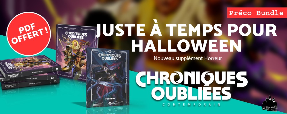 • Si vous n'aviez pas pledgé Chroniques Oubliées Contemporain pendant la préco participative ni précommandé un pack late pledge, optez pour le pack Halloween (livre de base + supplément Horreur + PDF offerts pendant la période de précommande)