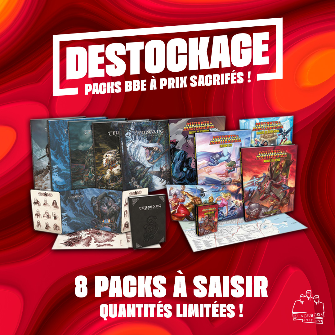 La réglementation française sur le prix unique du livre, qui a bien des avantages par ailleurs, rend très complexe voire impossible les promotions sur la plupart des produits assimilés aux livres et donc au jeu de rôle. En revanche, vous pouvez vous tourner vers nos 9 packs BBE en déstockage sur 6 gammes : East Texas University, L'Oeil noir, Starfinder, Monstres et Mutants & Masterminds mais aussi les jeux Labyrinth !