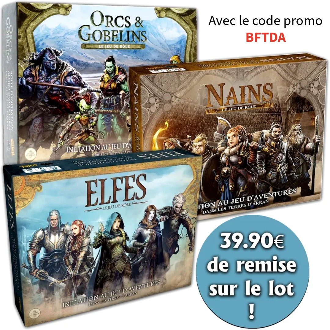 Et en cette semaine de bonnes affaires, on vous propose également 1 offre 3 boites achetées, 1 offerte sur les boites Terres d'Arran dans l'univers des BD - il vous suffit d'entrer le code promo "BFTDA" lors de la commande !