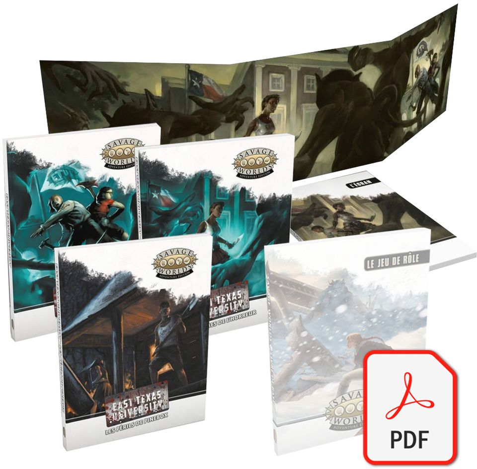 - East Texas University (écran du MJ) : combine des tables spécifiques à cet univers et quelques incontournables tables génériques de Savage Worlds Adventure Edition (SWADE).En plus de l’écran 3 volets, vous y trouverez également une aventure originale de 30 pages intitulée La bague de promo.