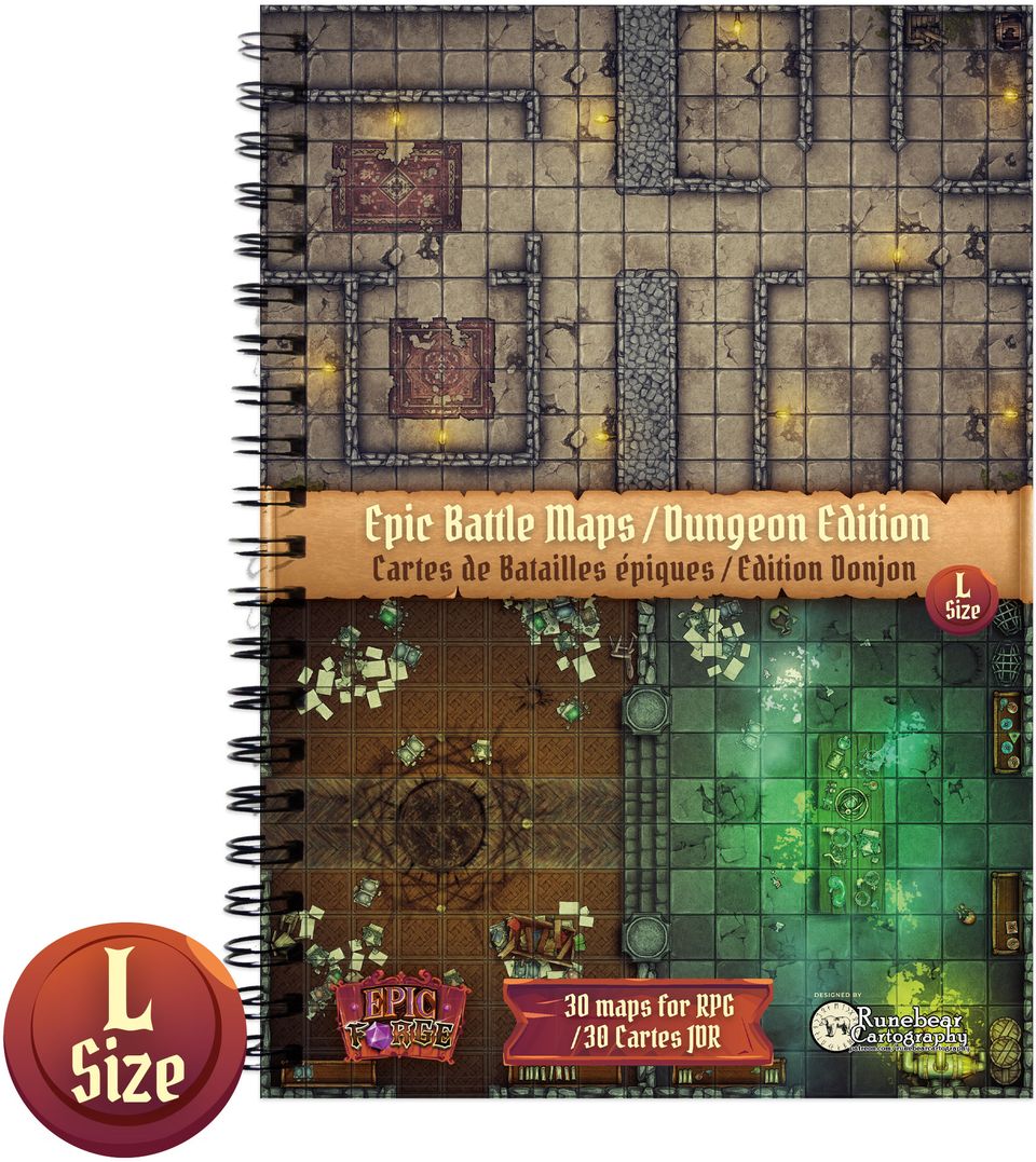- Donjon Taille L : ici pas de grandes plaines, mais plutôt des tunnels puants d'égouts mal famés, ou des temples souterrains dans lesquels loger les rituels les plus sombres. Il y a ici tout ce qu'il vous faut pour vos séances de dungeon crawling.