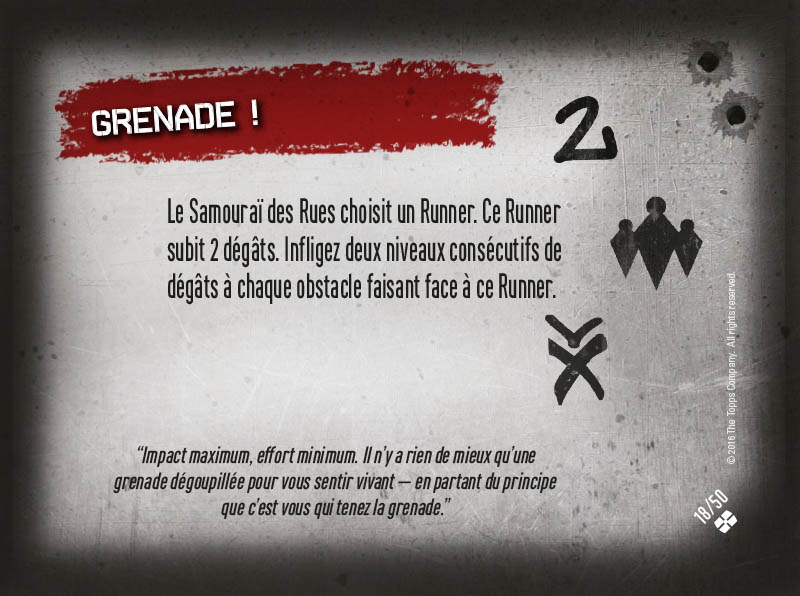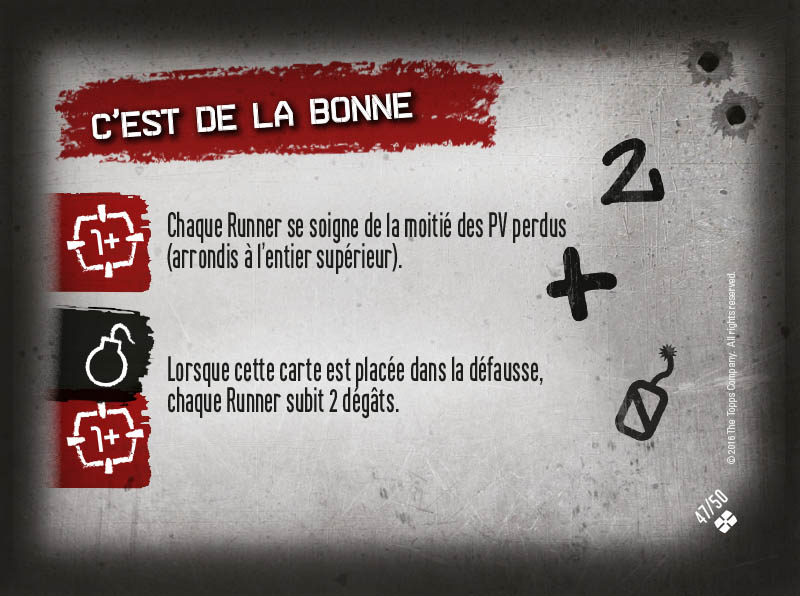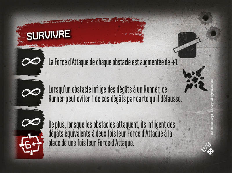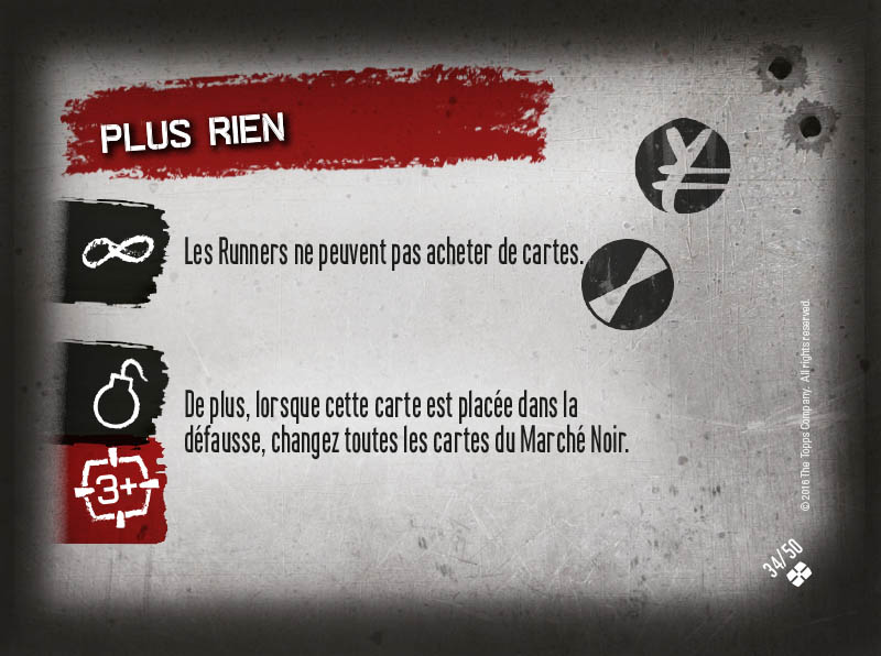 Au début de chaque séquence de jeu, on pioche une carte Crossfire, dont les effets s'appliquent de base sur tous les joueurs pendant la séquence. Comme vous le voyez sur les 4 exemples ci-dessous, il y a des effets qui s'appliquent instantanément (première carte ci-dessous), mais aussi des effets particuliers. Le symbole "infini" indique un effet dit "Permanent" (qui s'applique à tout moment de la séquence de jeu), un effet "bombe à retardement" qui se déclenche quand la carte est placée dans la défausse (généralement à la fin de la séquence de jeu), et un niveau de Crossfire, symbolisé par l'icône "6+" de la deuxième carte ci-dessous par exemple, qui indique qu'un effet se déclenche uniquement si le nombre de cartes dans la défausse des cartes Crossfire est égal ou supérieur au chiffre indiqué. Vous l'avez compris, comme dans tout bon vieux run, plus le temps (de jeu) passe, plus les cartes Crossfire déclenchent des effets dévastateurs... et plus le run part en sucette et devient difficile ! Les montées en pression des cartes Crossfire sont terribles et forment le piment essentiel du jeu.