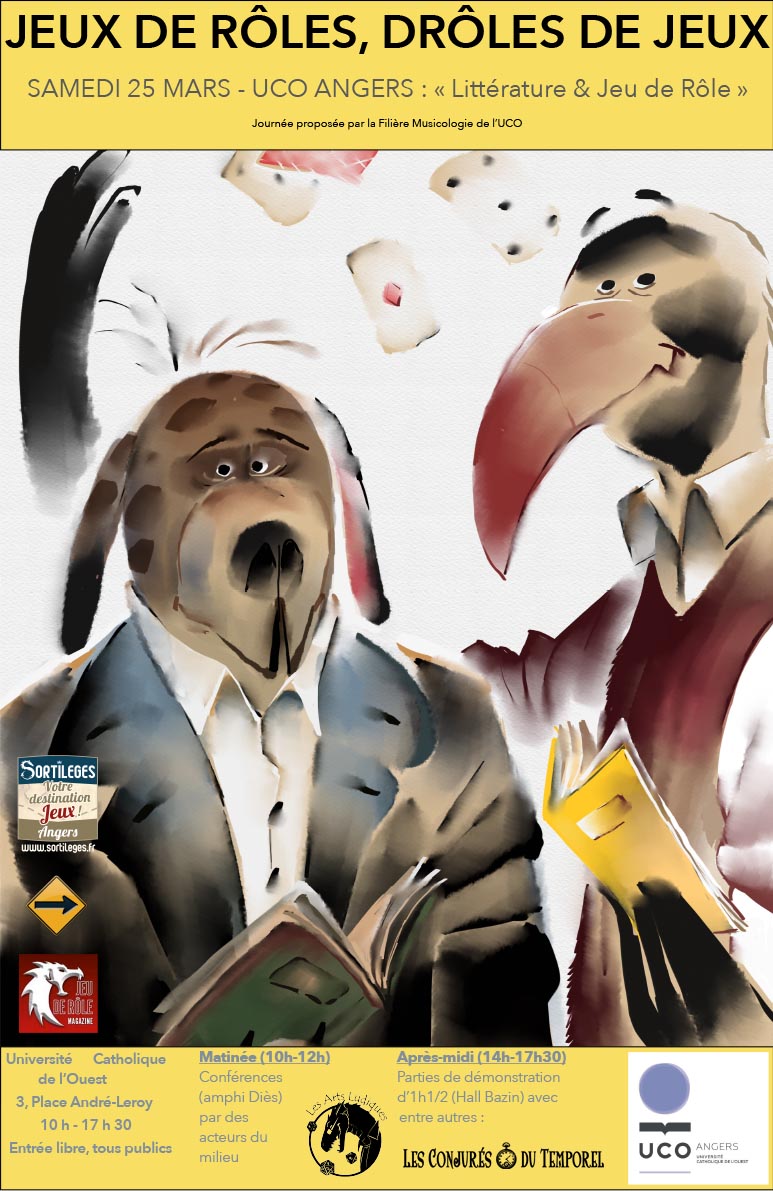 Le samedi 25 mars, à l'Université Catholique de l'Ouest à Angers, se déroulera une journée d'initiation au JdR, pour la 4e année consécutive, sous la houlette de Denis Huneau, déjà responsable entre autres de la co-composition du générique de fin de Héros&Dragons et de la traduction de plusieurs suppléments pour l'Appel de Cthulhu.