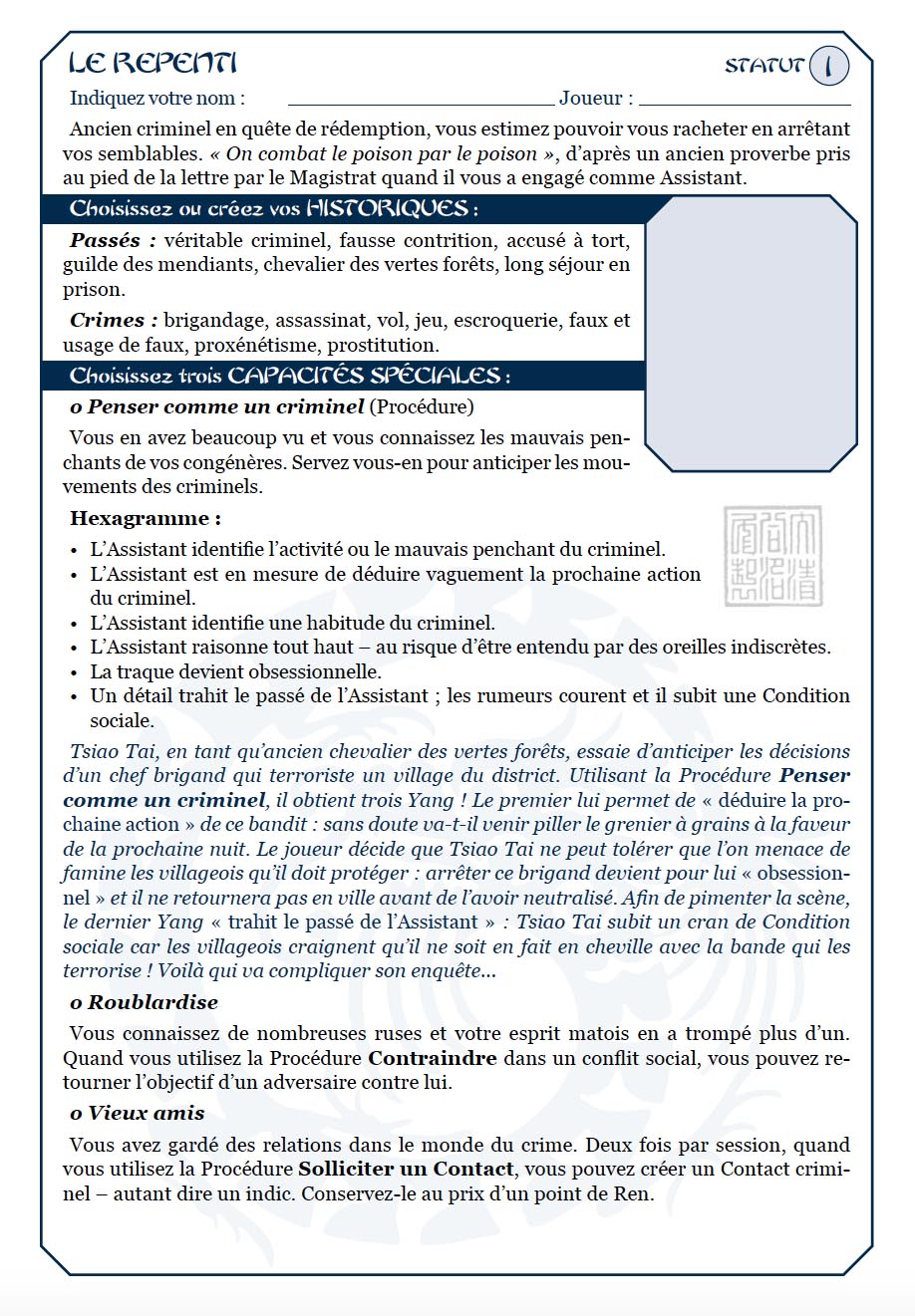 Publié en trois parties dont la dernière vient de paraître dans Casus Belli #21 (disponible ici en version papier et/ou PDF), le JdR a bénéficié d'une série d'aides de jeu proposées par Romain et Benjamin que vous pouvez retrouver ici, à laquelle s'ajoute désormais un nouveau PDF gratuit, regroupant des feuilles de personnage que nous vous laissons découvrir en cliquant ici !