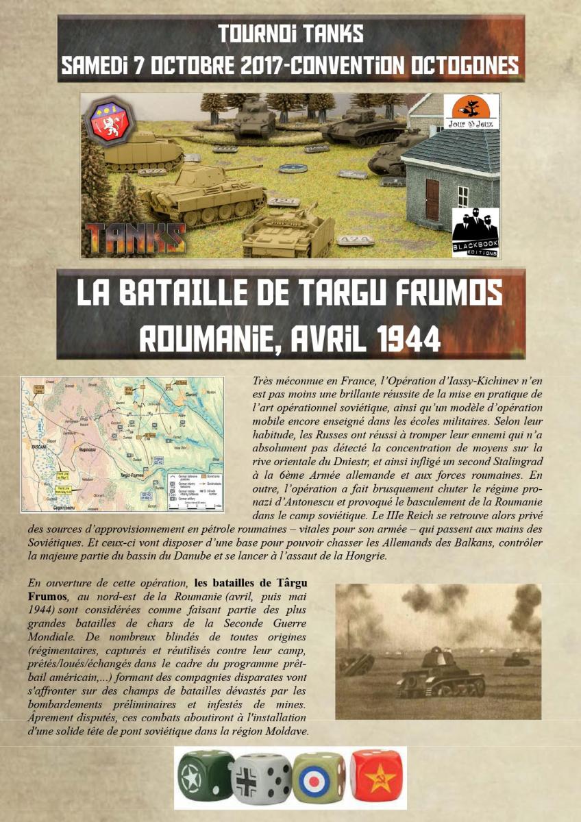 • Enfin, en plus de tables de démonstration, un grand tournoi Tanks sera organisé le samedi après-midi, avec 3 tables permanentes et des lots à gagner, sous une thématique "Les batailles de Târgu Frumos" (non, ce n'est pas une région du Mordor, et oui, c'est historique ; voir plus bas). Pour vous inscrire, envoyez un mail à damien@black-book-editions.fr qui confirmera votre participation.