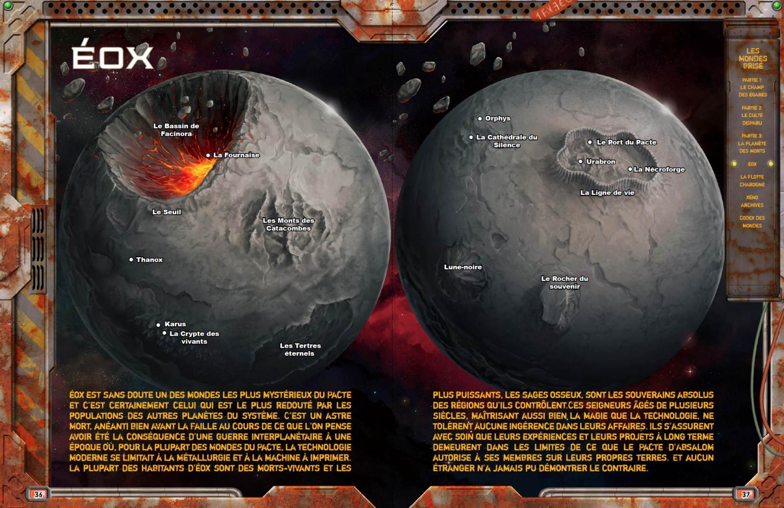 Dans cette seconde preview - la première présentait la goule Wanéda Trux - nous vous dévoilons quelques éléments de l'article dédié à la description de la planète Eox, qui permettra d'étoffer le passage des PJ sur la planète mort-vivante lors de la campagne, où pour créer vos propres scénarios.