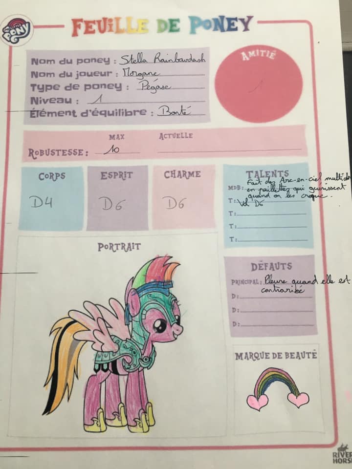 Si tu as regardé l'émission en live, en replay ou si tu as chez toi le livre de base de Tails of Equestria, tu peux nous envoyer ton poney soit dans le groupe Facebook (c'est un groupe public, tout le monde pourra voir tes créations) ou par mail à contact@rolenplay.com. N'hésite pas à noter également ton prénom (ou un nom inventé si tu préfères) ainsi que ton âge, pour qu'on puisse plus facilement te retrouver après, comme Morgane (4 ans) dont tu peux voir ici la fiche de poney-joueur ! 👋