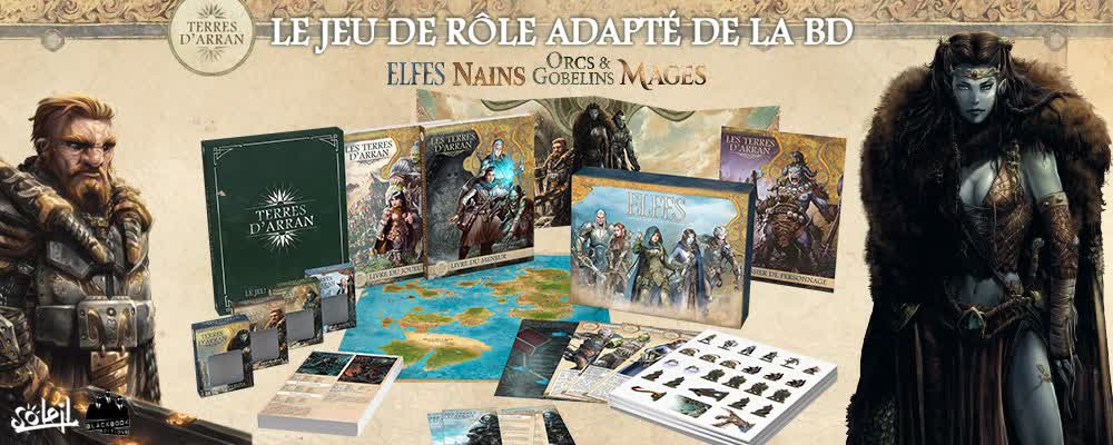 - à temps pour les fêtes, la boîte Elfes - la boîte d'initiation au jeu de rôle dans les Terres d'Arran fera un très beau cadeau pour les amateurs de fantasy et de l'univers des BD publiées chez Soleil - très bientôt en préco !