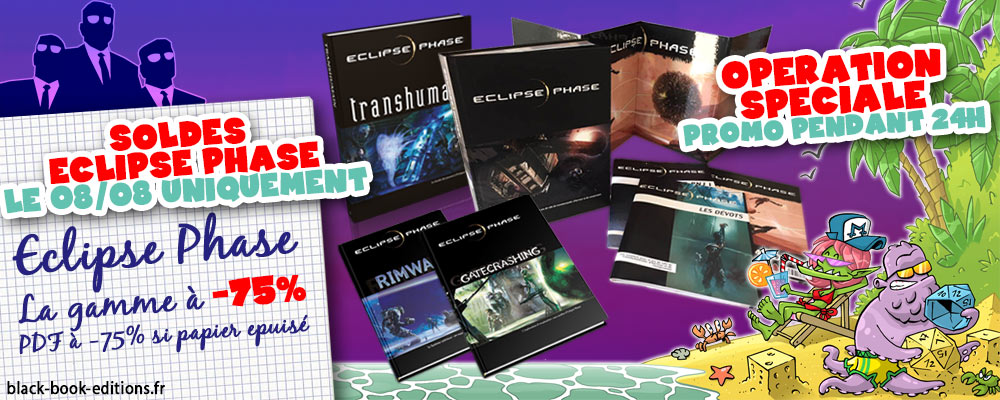 Alors que notre opération spéciale sur Shadowrun 5 (-50%) se poursuit, Black Book Editions vous propose aujourd'hui uniquement une opération spéciale sur Eclipse Phase : les ouvrages de la gamme SF transhumaniste de Posthuman Studios sont à -75%, valables sur le PDF quand l'ouvrage papier correspondant est épuisé.