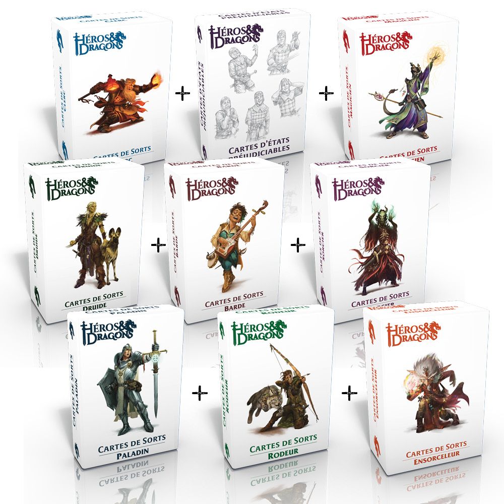 La meilleure solution pour cela ? Opter pour notre offre de Pack complet de cartes de sorts et d'états Héros & Dragons, disponible en quantités limitées pendant la durée de la précommande, qui rassemble les 9 decks existants dont 1 offert (le deck de cartes d'états préjudiciables d'une valeur de 10 euros soit 7% de réduction sur la valeur totale du pack).